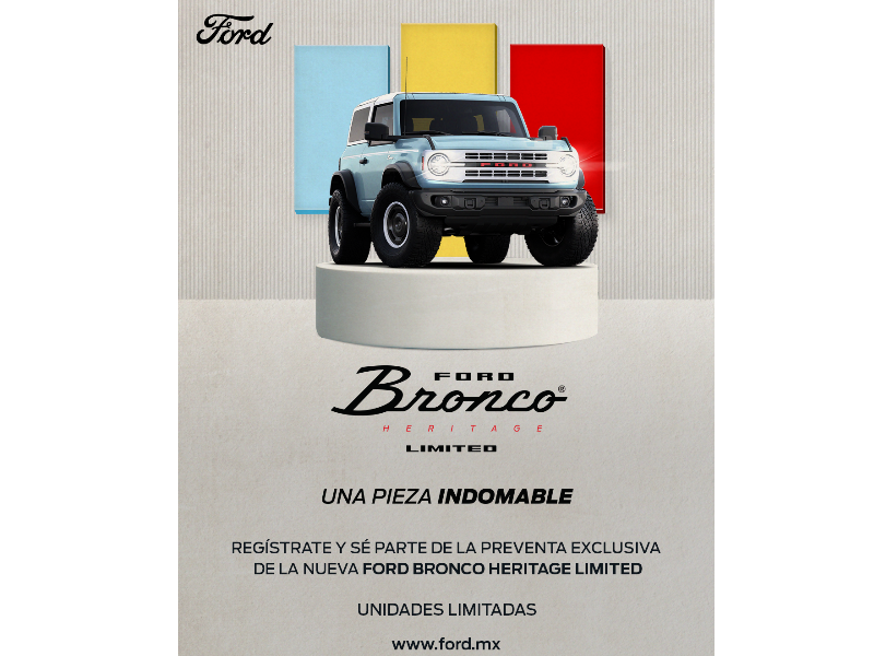 Desde su llegada al mercado, Ford Bronco se ha convertido en el vehículo Off-Road por excelencia. Sus primeros años marcaron un inicio del legado todoterreno en la historia del automovilismo, por ellos Ford presenta la Edición Ford Bronco Heritage Limited de dos puertas, un modelo que combina un diseño clásico con toda la potencia, tecnología y modernidad de los modelos actuales. Ford Bronco Heritage Limited es la integrante de la Familia Heritage más equipada, y por lo mismo, más exclusiva y limitada en producción.