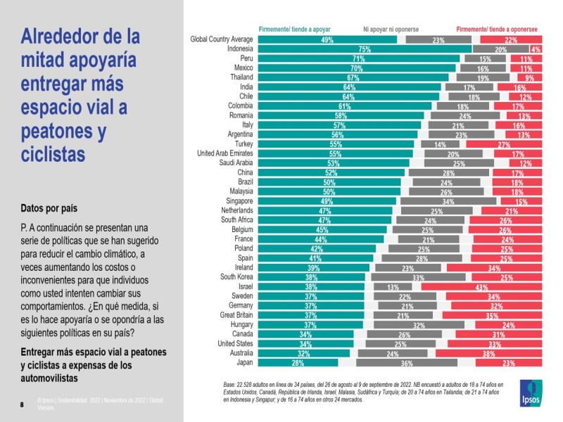El 70% de los mexicanos encuestados desea una política de movilidad que favorezca la creación de nuevos espacios viales para peatones y ciclistas. México es el segundo país de la tabla general en este rubro, solamente detrás de Perú (71%).